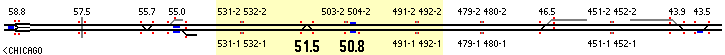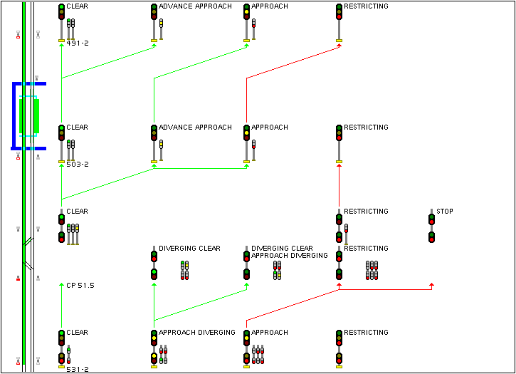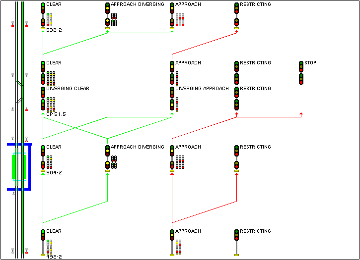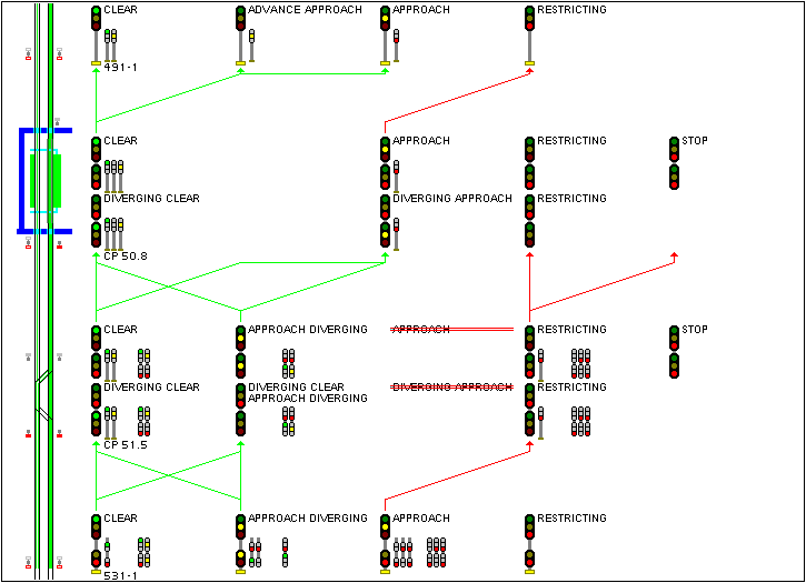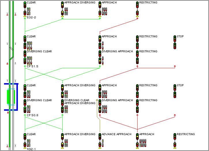 Eastbound TrainsWith normal right hand running trains heading eastbound from Chicago use track 1. Eastbound trains may also use track 2.![]() Follow the signals eastbound from the bottom of the diagram to the top as all aspects available are shown at each location. The smaller signals show which aspects at the next signal west will lead to the aspect illustrated (on each track). Restricting is always shown if the track is occupied between locations. Stop is shown if the track is occupied at the location (before the opposing signals) or the train does not have permission to proceed. Approach and Diverging Approach are not shown eastbound at CP 51.5. A Restricting signal is displayed. The signals on track 2 at CP 50.8 are intermediates (503-2 / 504-2). The diagram below shows the signals from 531-2 through 491-2 on track 2. Note the limited aspects at CP 51.5 (no Approach or Approach Diverging). Yellow lamps are not used. ![]() Signal Progression ![]() Westbound trains travel right to left approaching CPs and even numbered intermediate signals. Eastbound trains travel left to right approaching CPs and odd numbered intermediate signals. (Track numbers follow the dash in signal numbers on intermediate signals.) If a train is present in a block marked in red or the signal entering that block is set to stop the signals in the preceeding blocks will follow the approach and clear aspects shown. Flashing red denotes blocks where restricting replaces approach. |
