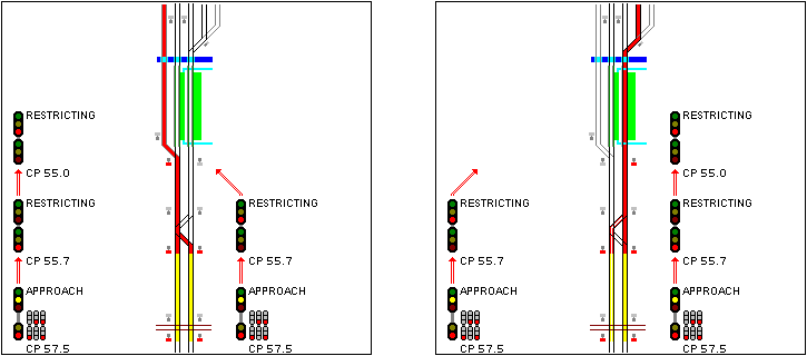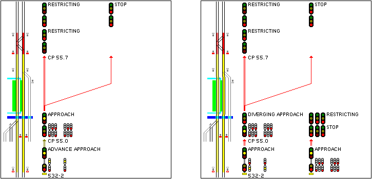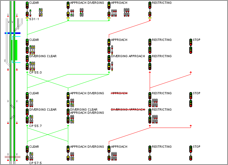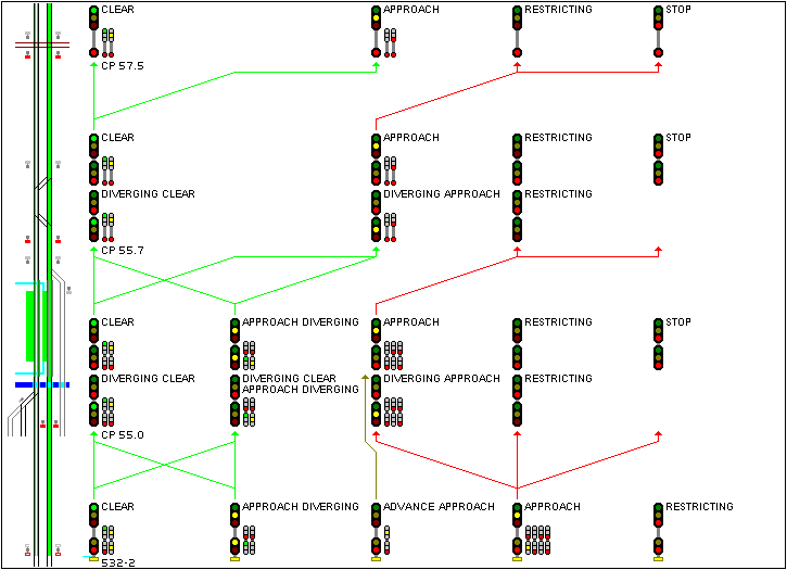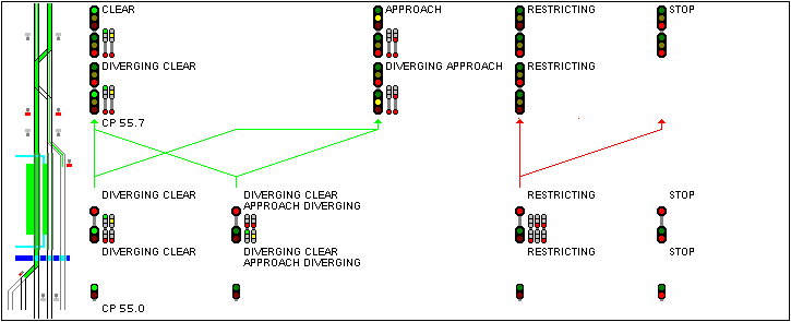 | The following diagrams detail the signal aspects possible for CP 55.7 and CP 55.0 in Miller.