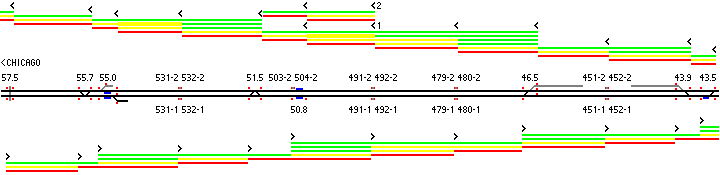 Eastbound TrainsWith normal right hand running trains heading eastbound from Chicago use track 1. Eastbound trains may also use track 2.![]() Follow the signals eastbound from the bottom of the diagram to the top as all aspects available are shown at each location. The smaller signals show which aspects at the next signal west will lead to the aspect illustrated (on each track). Restricting is always shown if the track is occupied between locations. Stop is shown if the track is occupied at the location (before the opposing signals) or the train does not have permission to proceed. Approach and Diverging Approach are not shown eastbound at CP 55.7. A Restricting signal is displayed. CSX Connection (Track 2) and Storage Track (Track 1) ![]() Trains traveling to the CSX Connection approach CP 55.0 on track 2 (the left hand track eastbound). Trains traveling to the Miller Storage Yard approach CP 55.0 on track 1 (the right hand track eastbound). Trains can cross over ta CP&mnsp;55.7 approaching CP 55.0. Signal Progression ![]() Westbound trains travel right to left approaching CPs and even numbered intermediate signals. Eastbound trains travel left to right approaching CPs and odd numbered intermediate signals. (Track numbers follow the dash in signal numbers on intermediate signals.) If a train is present in a block marked in red or the signal entering that block is set to stop the signals in the preceeding blocks will follow the approach and clear aspects shown. Flashing red denotes blocks where restricting replaces approach. |