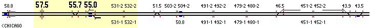 CP 57.5 and intermediates at 531/532 are also shown. Both tracks at both stations have high platforms and gauntlets. CP 57.5 is a diamond crossing of an industrial lead (EJ&E "one way low speed" OWLS diamond). CP 55.0 has an eastbound connection to a CSX line from track 2 and a storage yard on track 1. Selected eastbound trains terminate at Miller and return to Chicago as eastbound trains.