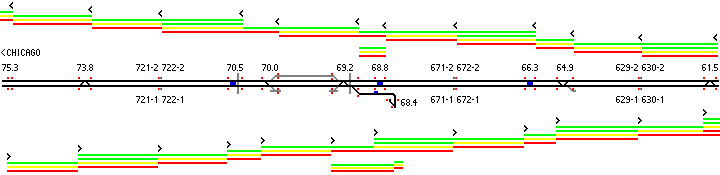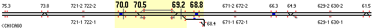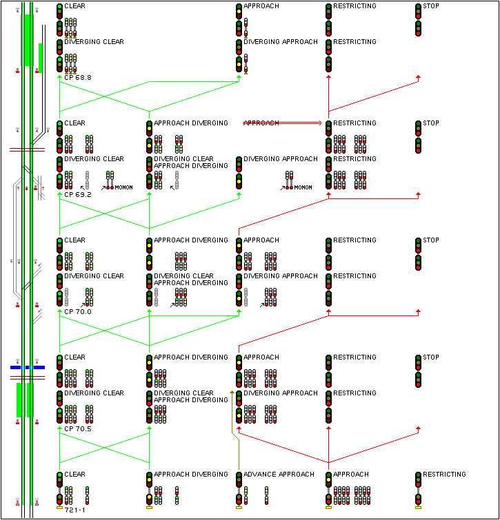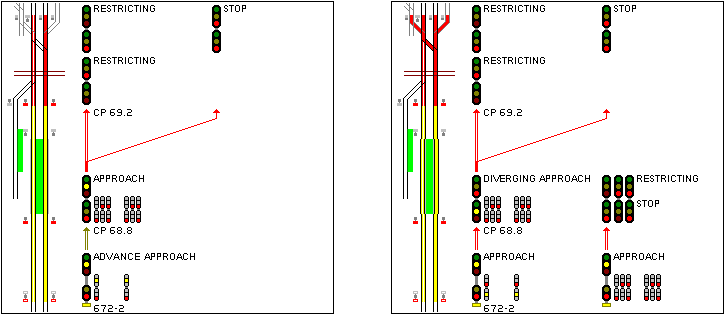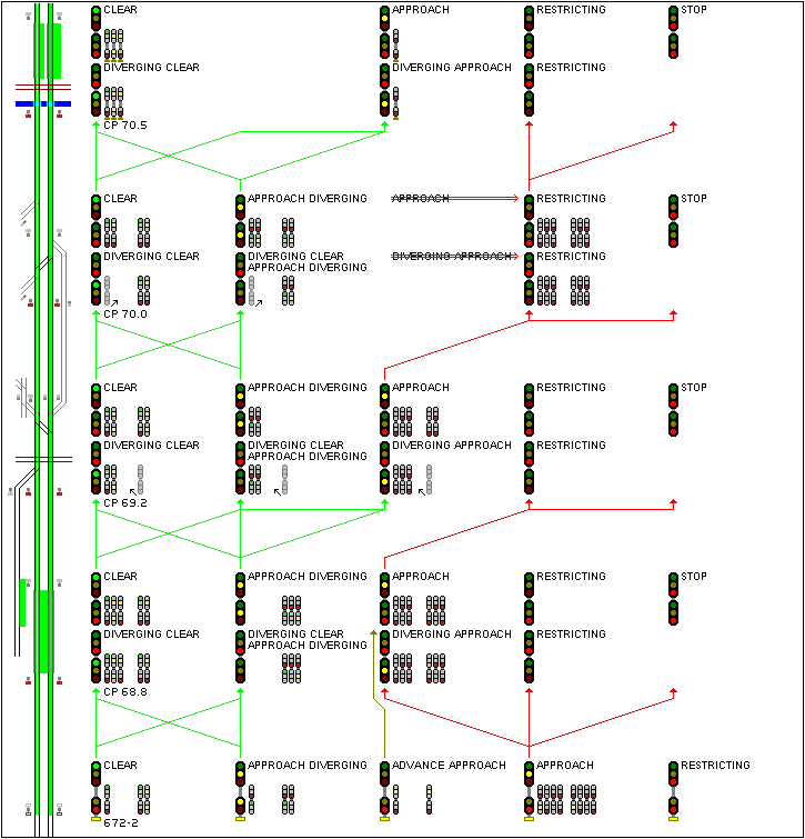 Westbound TrainsWith normal right hand running trains heading westbound from Chicago use track 2.Westbound trains may also use track 1. ![]() Follow the signals westbound from the bottom of the diagram to the top as all aspects available are shown at each location. The smaller signals show which aspects at the next signal west will lead to the aspect illustrated (on each track). Restricting is always shown if the track is occupied between locations. Stop is shown if the track is occupied at the location (before the opposing signals) or the train does not have permission to proceed. Approach and Diverging Approach are not shown westbound at CP 70.0. A Restricting signal is displayed. CP 68.8 Approach and Diverging Approach are shown westbound at CP 68.8. The intermediate signal at 672-2 (672-1 on track 1) provides advance warning. The following diagram compares signals for a train headed toward a Restricting or Stop signal at CP 69.2. Advance Approach at 672-2 and Approach at CP 68.8 indicates the train will take the track closest to the platform at the gauntlet but must be prepared to stop at CP 69.2. Approach at 672-2 and Diverging Approach at CP 68.8 indicates the train will use the bypass track at the gauntlet and be prepared to stop at CP 69.2. Approach is also shown at 672-2 if CP 68.8 is Restricting or Stop. This configuration allows a passenger train stopping at the platform to enter CP 68.8 on an Approach signal (instead of Restricting) or a freight train to pass on the bypass track and enter the state line yard at CP 69.2. ![]() Monon Corridor The Monon Corridor enters the main line at CP 69.2 using a diverging signal as shown below. There is no crossover to track 2 for westbound trains. Trains will cross over to track 2 (normal for right hand running) at CP 70.5.