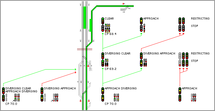 | The following diagrams detail the signal aspects possible for CP 70.5 at the Hegewisch station,