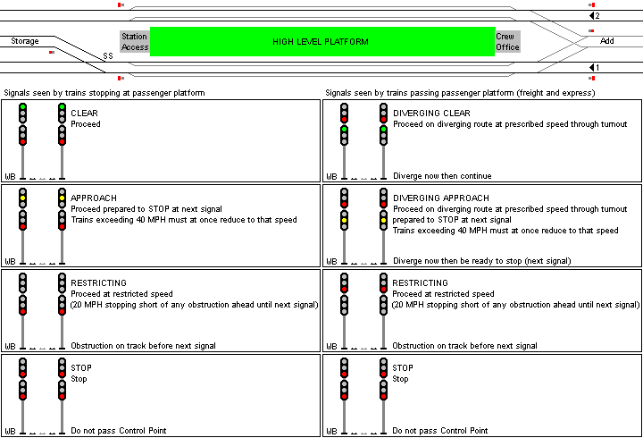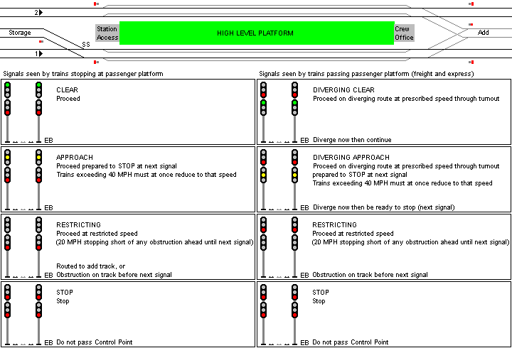 of the control point. To control the new gauntlet the CP can be extended by moving the eastbound signals to the west of the gauntlet before the platform. The westbound signals are moved as needed to east of the gauntlet. The potential signal aspects are shown below. The plan presented on this page is not an official plan from NICTD and due to the double track project is unlikely to be built. The double track project features a new station at Miller with two storage tracks, high level platforms and large commuter parking lots. This eliminates the need for the add track at Gary Metro and any rebuild would likely include the removal of the add track and the installation of normal gauntlet signalling. Eastbound Trains - Normal Right Hand Running |