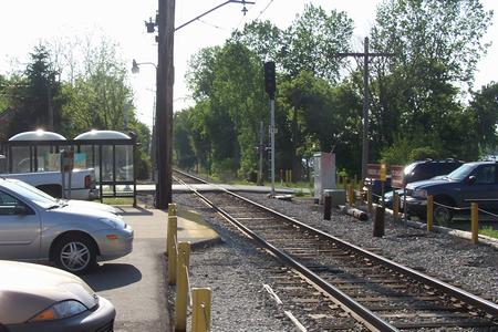 A flag stop is located in Hudson Lake. It is the last stop in LaPorte County eastbound and the furthest stop east in the Central Time Zone. Shown at the left as it appeared in 1998 not much has changed in over a decade. The signals shown (148, 149 behind pole) were removed in October 2010. | |