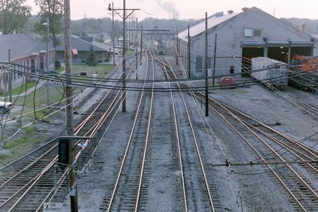 | The 1998 view to the west from a bridge over the yard. To the left is the back of the first automatic block signal eastbound toward South Bend (this signal was moved to the east end of the yard before being removed in 2011). To the right is the SouthShore Freight diesel shops. | The 1998 view to the east showing the cleaning shop and storage lanes. In 2009 the second track from the right is used as the through track from South Bend. The next four tracks are used for car storage, with the building to the left serving as a car wash. The track furthest to the right with the hopper car on it remains a freight siding. |