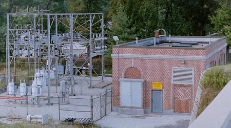 | The 1998 view to the Northeast showing the electric shops and feeder lines. The car to the center right is a wreck damaged car that is not on a track. | The Eastport electric substation is located just to the west of Roeske Rd as part of the Shops complex. (There are actually three substations east of Eastport. Photo from 1998.) |