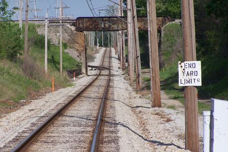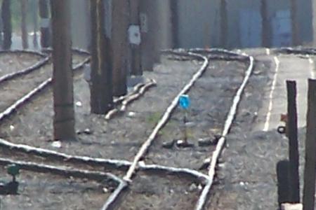 ![]() The main line through the yard takes a shift to the south just after entering the yard. Derails and blue signal protection is used to protect yard tracks used for storing cars overnight. The platform between storage tracks is for the use of employees. The main line once ran straight through the yard with the track on the left used as a freight siding. |
