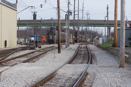 Michigan City Carroll St (Shops) Station and YardThe Michigan City Yard is used for overnight storage and maintenance of all electric trains, as well as the diesel locomotive shops and the operations center for the SouthShore freight operation. A passenger stop exists at the small shelter. |