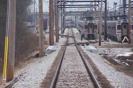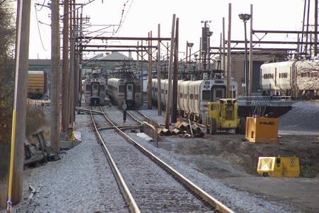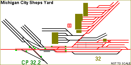 ![]() Shown above is car 9 leading a South Bend to Chicago train. | ![]() The yard layout. Electrified tracks are shown in red. |