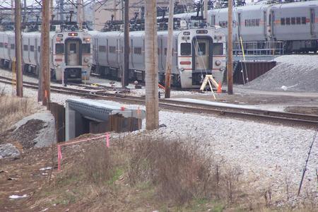 | In the fall of 2013 the bridge over Trail Creek at the east end of the yard was removed and replaced by a new span. The new bridge was built just north of the old bridge and moved into place during a ten day outage in late October. (Passengers on through trains were bused between South Bend and Michigan City.) The completed span is shown below. |