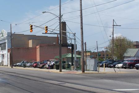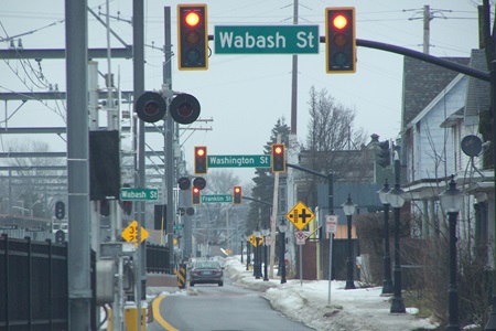 The historic station building and main parking lot as seen in 2016 after the city completed a streetscape project replacing curbs and adding trees and ornamental lights. As part of the streetscape project a sign was placed in front of the parking area. The lights from the streetscape project have been reinstalled. On the last street running section of the South Shore in downtown Michigan City, the railroad ran down the middle of 11th St downtown, and 10th St on the west side of town. The white faced building was the old South Shore station (closed in 1987). The parking area to the right is the location of the former South Shore bus garage. Note the traffic signal in the photo below with yellow bulbs where the green lights usually are. These bulbs flashed until a train approached then the lights changed to yellow then red to give a signal to cars not to drive through the platform area while a train was present. |