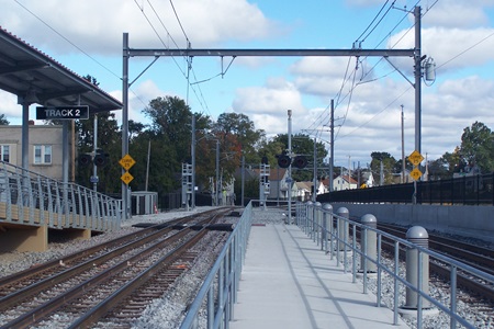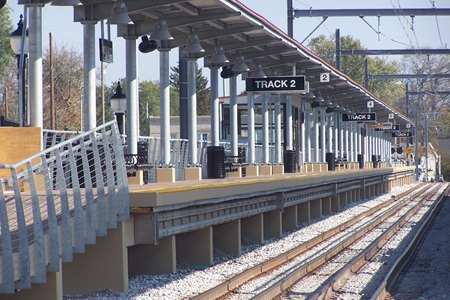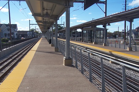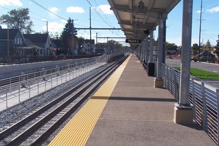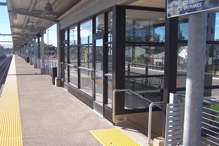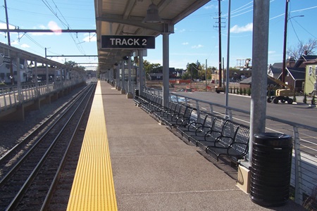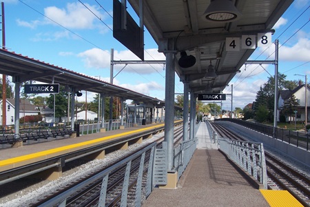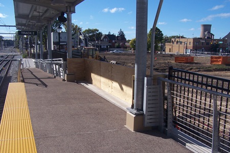 Number signs are mounted on the platform canopy to mark where trains should stop. The Track 2 platform is long enough for a full eight car train and is marked so an eastbound train would stop at the west end of the platform (near the station building and Franklin St). |