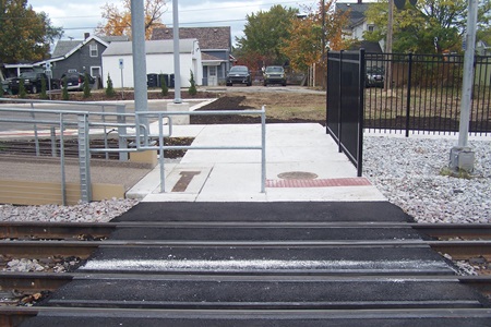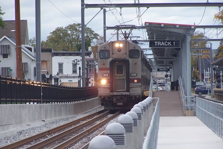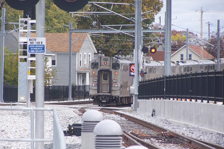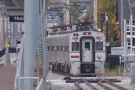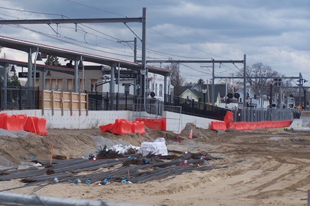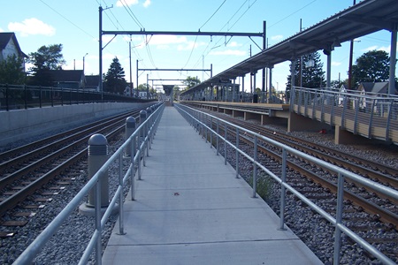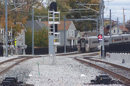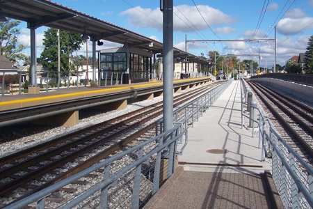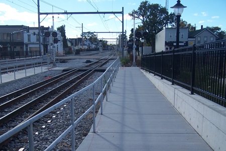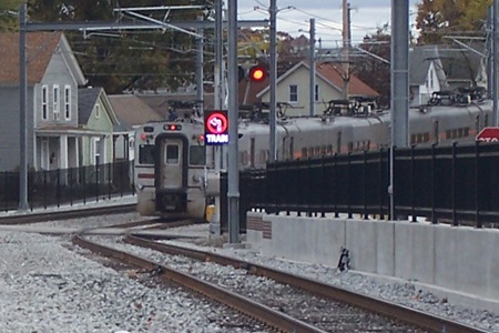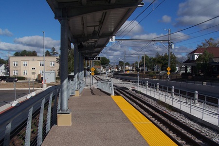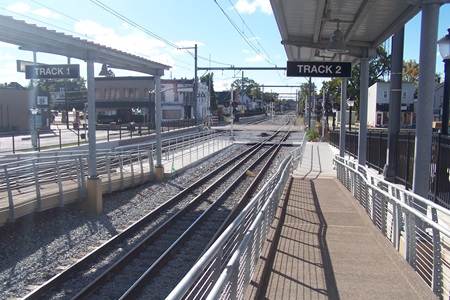 With the new station extending to Cedar St the Lafayette St curve can now be seen from the station. The "No Left Turn Train" sign activates with the crossing lights and gates to warn drivers not to turn left in front of a train. |