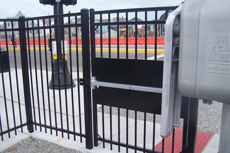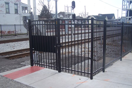 The north side fence along 11th St has escape route gates that can be opened with a crash bar. While people on the wrong side of the fence could go around the end of the fence, the gates allow people to exit without getting closer to the tracks. (These people could be workers or passengers evacuating a train.) (Feb 2024) |