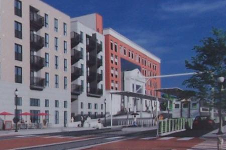 A banner posted on the construction fence features an illustration of the apartment / retail building and parking structure / station building under construction. The illustration shows where the facade of the old building will be placed. (Mar 2024) |