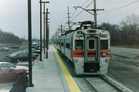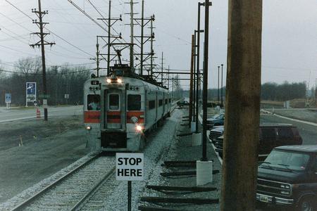 | Late in 1998 with the new parking area open a two car train consisting of cars 12 and 24 makes an eastbound stop at the new platform. The old platform and shelter has been removed and parking is no longer permitted on the south side of the tracks. Construction is beginning on the roadbed for the second track. | |