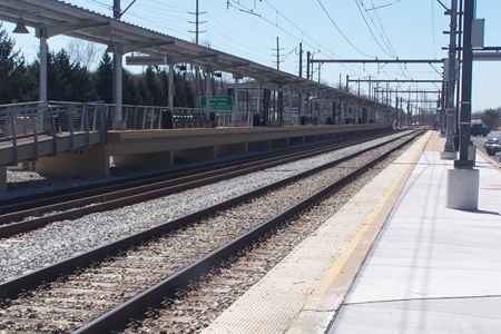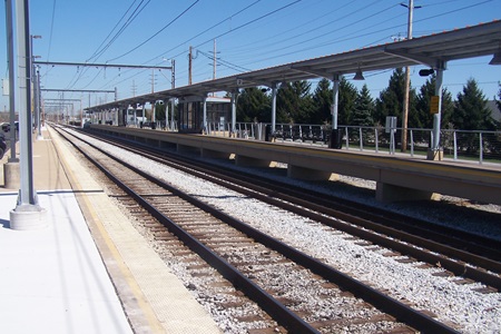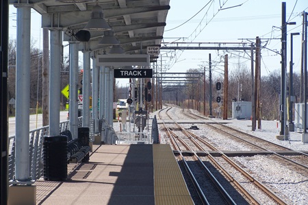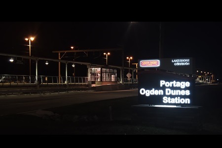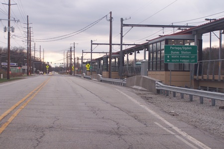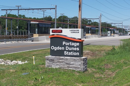Portage / Ogden Dunes StationThe station at Ogden Dunes has grown from being a simple flag stop to being a major station on the South Shore line. The line past Ogden Dunes was double tracked during a construction project in 1998-1999. A new low boarding platform was constructed along the north side of the former single track and a second track was added to the south of the former single track. Asphalt walkways were installed to allow passengers to cross over to the new track to board trains. Concrete boarding ramps were installed to provde access for ADA passengers.As part of the 2022-2024 Double Track Northwest Indiana project that extended double track from Gary all the way to Michigan City, Ogden Dunes receive additional upgrades including a high level platform and gauntlet on track 1 (the south track) and an additional large parking lot south of US 12 (Dunes Highway) which runs just south of the South Shore tracks. |