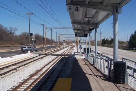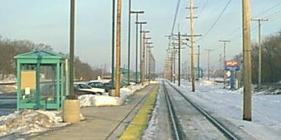 Ogden Dunes was a flag stop until November 1997 (the 1997 station is pictured to the left). A double tracking project linked the Wilson and Wagner sidings and this station received new platforms and a new parking area. The new parking area and westbound platform opened in November 1998. The eastbound rail and platform was then built in the old parking area south of the tracks. Across the street (US Highway 12) from Ogden Dunes is the Wycliffe Substation. Prior to the station pictured here there was a wooden shack and parking along US 12 west of Hillcrest Rd. |