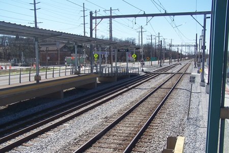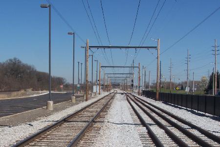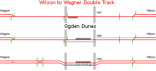 ![]() The diagram above shows the track layout in 1997, 1998 and 1999. 1997 with Wagner ending two miles west of Ogden Dunes and Wilson ending one and a half miles east of Ogden Dunes. 1998 with the new track extended from each siding and separate new track past the station (new platform to the north of the tracks). And 1999 with the track shifts in place. The crossover at Pauls was also added in 1999 as part of the project. |