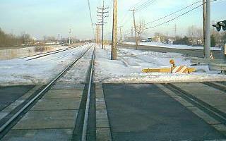 | A westbound train arrives on the then single main line. Looking east from the crossing at the east end of the station. The new double track is on the left (north) side of the old main line. The crossing has been rebuilt with the new track built on the right (south) side of the main. (January 16th, 1999) | |