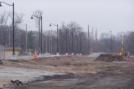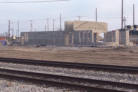 The storage yard under construction, looking west from US 12. The original alignment of US 12 (Dunes Highway) followed the South Shore track to the upper right where the yard was built. (Dec 2023)