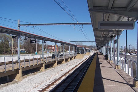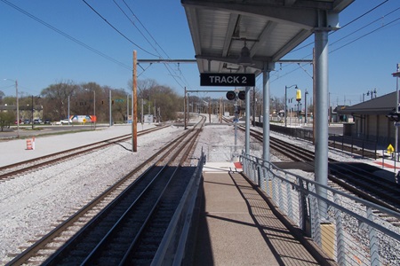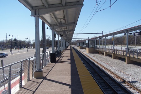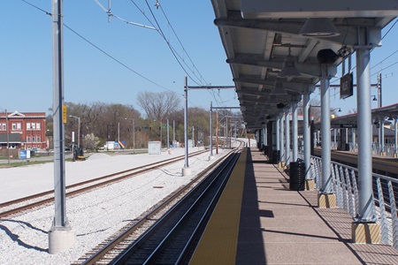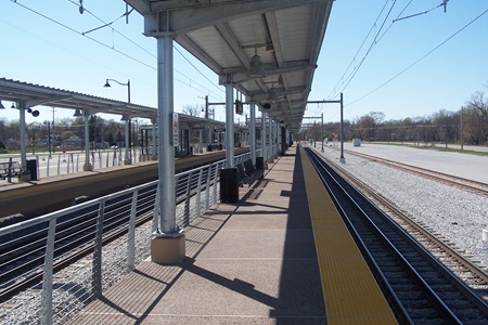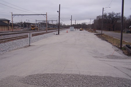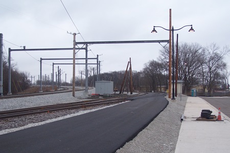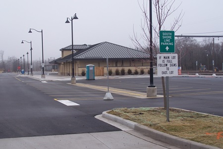 The former station and old US 12 (Dunes Highway) south of the station was demolished and cleared for construction of the double track high platform station with gauntlets. The parking lot has been expanded and modernized with additional parking available to the east of Lake Ave. (Dec 2022)