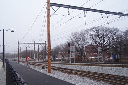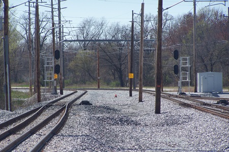 Looking westbound at the west end of the gauntlet tracks and the back of the eastbound signals (CP 55.0) at the station. (April 2024)