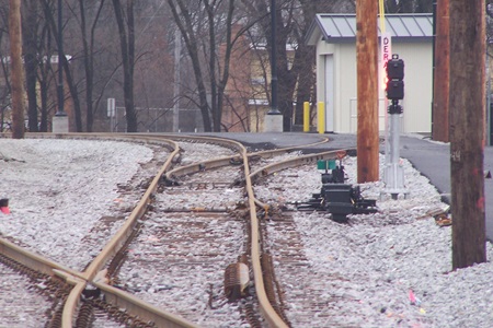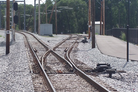 The switch for the passenger car storage yard shown aligned for an arriving train. A weekday eastbound train terminating at Miller will soon arrive and enter the yard. (July 2024)