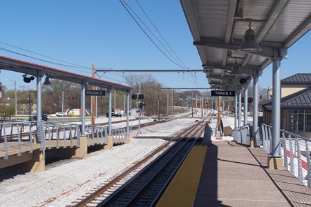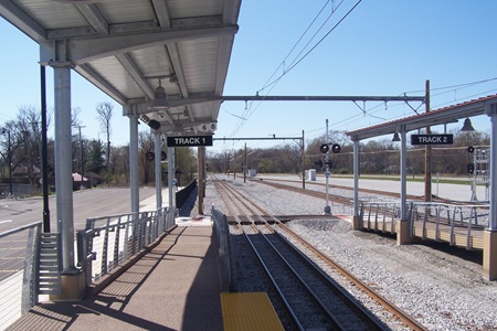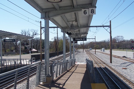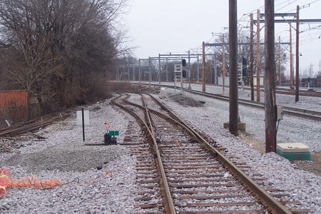 Track 2 looking eastbound from the east end of the platform. The CSX connection track is to the left. The old station was located to the left of the realigned connection track. (April 2024)