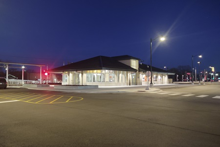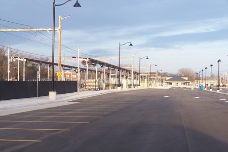 The station building as seen from the Lake St entrance to the west parking lot. The new double track is to the right with the new west parking lot to the left. The small parking area to the right is available. (Jan 2024)