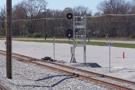 The signal for the CSX connection to join the main line at CP 55.0, just west of the station platform. The connection is now completely dispatcher controlled with a remote controlled derail. (April 2024)