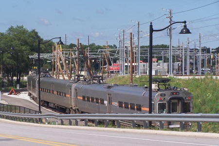 A string of cars wait in the yard for their next use as a westbound train (as seen from US 12 east of the station). (July 2024)