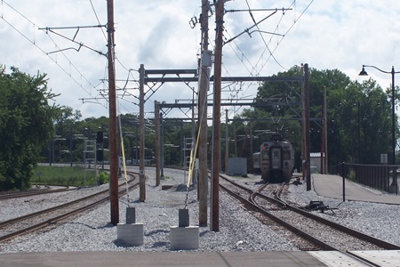 The storage yard under construction, looking east from the edge of the east passenger parking lot. Catenary was added to the main line tracks and one of the storage tracks and a fence now separates the yard from the parking lot. (Dec 2023)