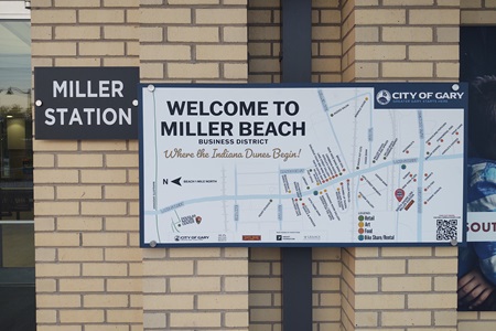 A similar sign by the south station entrance shows points of interest in the Miller Beach business district. (October 2024)