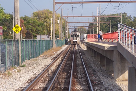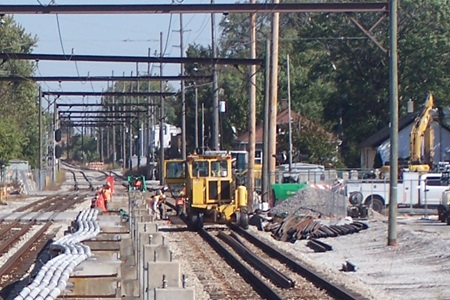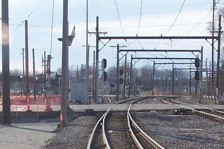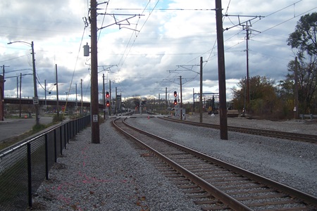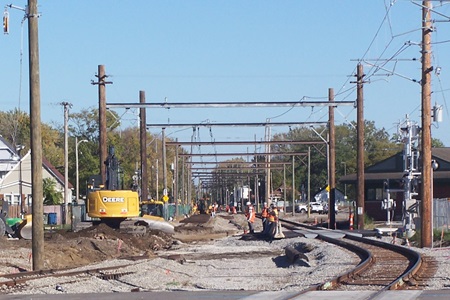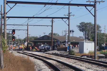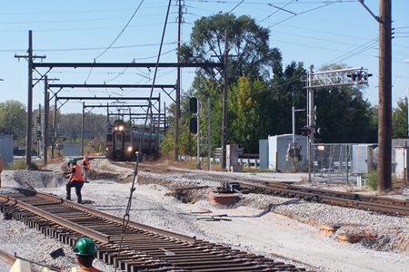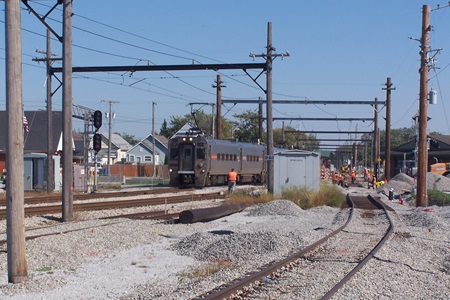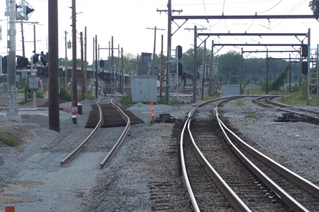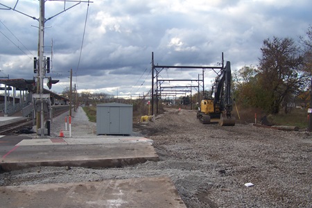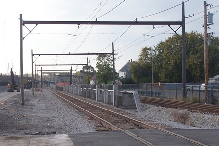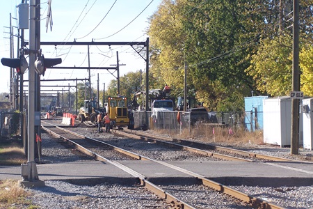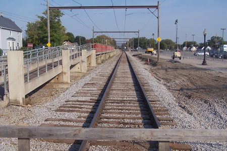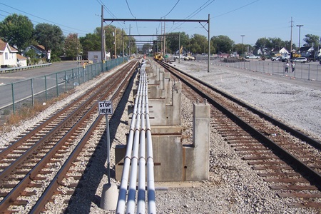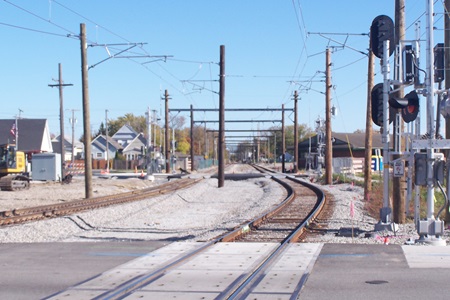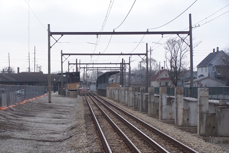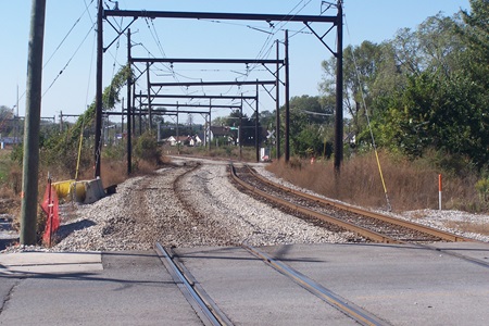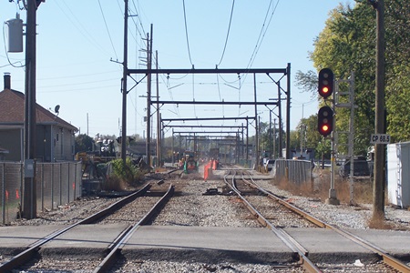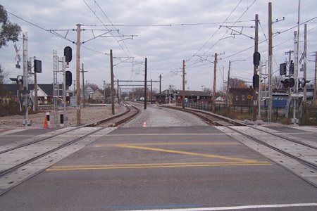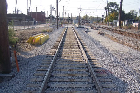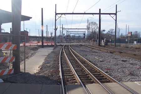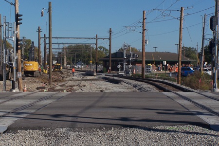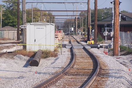 Looking west across Sheffield Ave as the second track is connected. (October 2024)