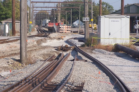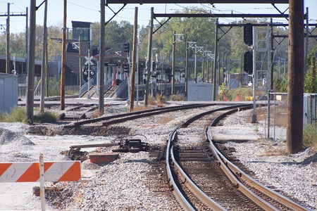 West of the 1998 Hammond Station the old alignment turns to the north (right). The new alignment for both tracks is shown under construction to the south (left) of the center of this picture. (March 2024)