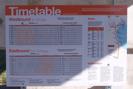 An outdoor version of the train schedule posted on a walkway between the parking lot and the platforms. (October 2024)