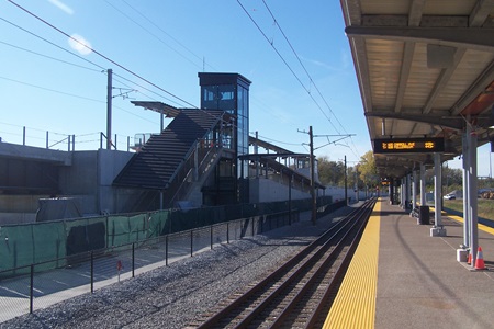 Looking west from the east end of the platform on opening weekend. (Catenary was not yet installed on track 2.) (October 2024)