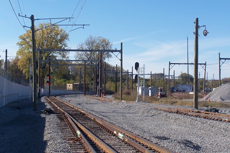 Looking east where the west end of the gauntlet and signal on track 1 have been removed. (October 2024)