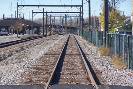 Looking east down track 1 from the crossing at the west end of the platform. The Monon Corridor and elevated platform is under construction on the right.(October 2024)