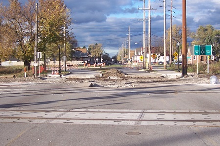 Looking west across Sheffield Ave during the crossing removal and repaving. (November 2024)