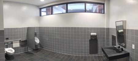 The ramp runs in two long segments (with breaks in each run as required by ADA). An elevator is being built to the left. (October 2024)