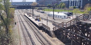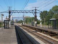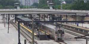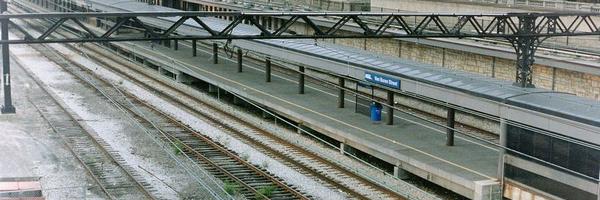 | 18th Street - Soldier Field - One central platform for 'local' trains. No facilities or ADA access. South Shore trains stop here only for special events. McCormick Place can be seen in the distance just south of the 18th St station. The nearest station regularly served by the South Shore is Museum Campus / 11th St. |