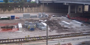 | Van Buren Street - The Metra Electric platform at Van Buren Street, shared with the South Shore Line. There are two platforms serving three tracks at this station. The furthest platform, built into the side wall, is for outbound trains leaving downtown - the other platform is primarily used for arrivals from inbound trains. A new track and platform are under construction to improve service for South Shore passengers. The new platform will have access to the existing Van Buren Street station by stairs and elevator and direct ramp access from the platform to East Jackson Dr and Ida B Wells Dr. |