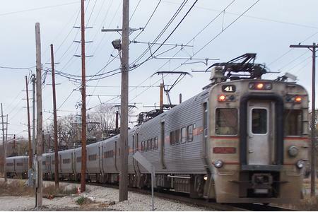Car 101 leads an eastbound train at Dune Park. Cars 101-110 delivered in 2001 have a cab at one end (odd cars east end as shown, even cars west end). These are typically run at the end of trains. Wrecked cars 11, 27 and 36 were also replaced in 2001. | ||